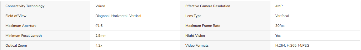 Monitor an indoor or outdoor area with the white O4BDD1M Camera from Speco Technologies. This unit uses a 1/3" progressive scan CMOS sensor to capture 2592 x 1520 resolution video at 30 fps. IR LEDs provide up to 164' of night vision. The camera features a 2.8-12mm motorized varifocal lens that delivers a 94.2 to 29.8° horizontal field of view. Red and blue lights provide a visual deterrent to keep intruders at bay.