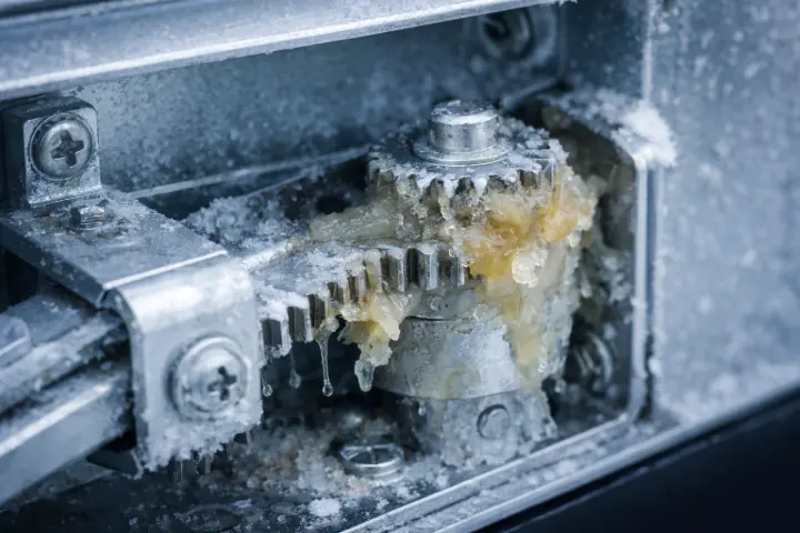 Steel door frames shrink measurably in extreme cold. These dimensional changes introduce stress at operator mounting points and connection arms. Components that tolerated minor misalignment in warmer temperatures now fracture under load.